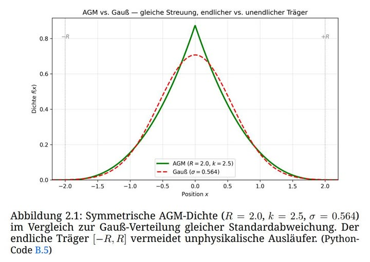 Die Gauß-Verteilung versagt in vielen empirischen Kontexten aufgrund ihres unendlichen Trägers und ihrer festen Symmetrie. Diese Arbeit führt das Asymmetrische Glockenmodell (AGM) ein, eine parametrische Familie von Wahrscheinlichkeitsdichtefunktionen mit endlichem Träger x 2 [µ – R; µ + R] und vollständig kontrollierbarer Schiefe und Kurtosis durch (…). Im Gegensatz zu approximativen Alternativen vereint das AGM vier entscheidende Eigenschaften in einem analytischen Rahmen: 1. Physikalische Konsistenz: Der Träger R kodiert explizit die maximale Abweichung und vermeidet unphysikalische Ausläufer. 2. Geometrische Interpretierbarkeit: (…) 3. Analytische Zugänglichkeit: Normierung, Momente und kumulative Verteilungsfunktion besitzen effizient auswertbare Ausdrücke. 4. Praktische Robustheit: Parameterschätzung konvergiert zuverlässig auch bei kleinen Stichproben. In einer Benchmark-Studie zu Aktienrenditen erreicht das AGM signifikant bessere AIC-Werte als die Normalverteilung, bleibt dabei jedoch physikalisch plausibel. In der Metrologie ermöglicht es die Modellierung von Zählraten nahe Null mit garantiert plausiblen Konfidenzintervallen. Damit etabliert das AGM einen neuen Standard für die Modellierung nicht-Gaußscher Phänomene mit natürlichen Grenzen.
