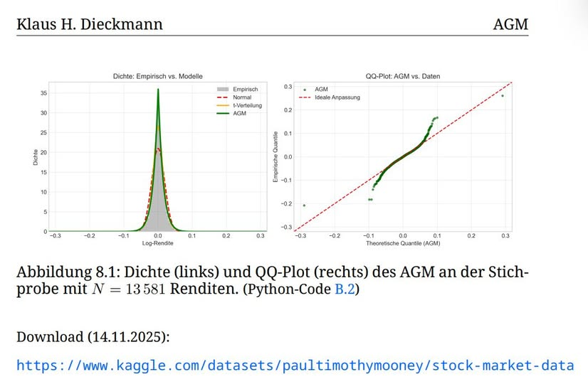 Das AGM erzielte mit AIC = −71 813 einen signifikanten Vorteil von ∆AIC = 2 758 gegenüber der Normalverteilung und liegt nur geringfügig hinter der t-Verteilung (∆AIC = 204), bei dem entscheidenden Vorteil eines intrinsisch endlichen Trägers x 2 [µ − R; µ + R] = [−0:289; 0:291], der unphysikalische Extremrenditen (jrj > 29%) strikt ausschließt.