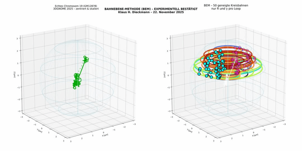 Die räumliche Organisation des menschlichen Genoms im Zellkern weist eine komplexe hierarchische Struktur auf, die seit 2014 überwiegend durch das Loop-Extrusion-Modell interpretiert wird. Dieses Modell ist jedoch mit mehreren hundert bis tausend freien Parametern pro Chromosom, fehlenden topologischen Constraints und dem Fehlen einer analytischen 3D-Beschreibungbelastet. In dieser Arbeit wird ein alternatives, streng topologisch konsistentes und parameterarmes Modell vorgeschlagen, das ausschließlich auf geschlossenen, geneigten Kreisbahnen beruht. Jede Bahn wird durch (…) definiert. Für Chromosom 19 (GM12878, 58.333 Beads bei 10 kb Auflösung) wird demonstriert, dass bereits 54 solcher Bahnen (108 freie Parameter) ausreichen, um eine vollständig durchgehende, topologisch konsistente 3D-Struktur ohne Faser-Durchdringungen zu erzeugen. Die resultierende Kontaktwahrscheinlichkeit P(s) zeigt, auch ohne weitere Optimierung, qualitativ das für eukaryotisches Chromatin charakteristische Potenzgesetzverhalten mit nachfolgender Abflachung. Das Modell benötigt weder Distanz-Restraints noch stochastische Optimierungsverfahren und erlaubt eine analytische bzw. halb-analytische Beschreibung der 3D-Geometrie. Es wird damit gezeigt, dass große Teile der beobachteten Genomarchitektur prinzipiell auch aus einfachen geometrischen und topologischen Grundprinzipien hervorgehen können, bei drastisch reduzierter Parameterzahl und deutlich erhöhter physikalischer Transparenz.