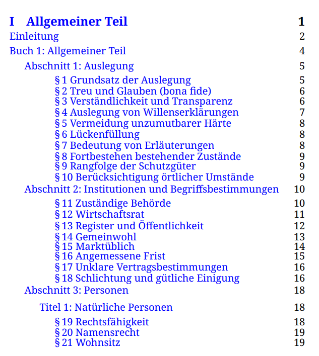 Erstes Buch: Allgemeiner Teil – Grundlagen, Prinzipien, Auslegungsregeln, Definitionen.